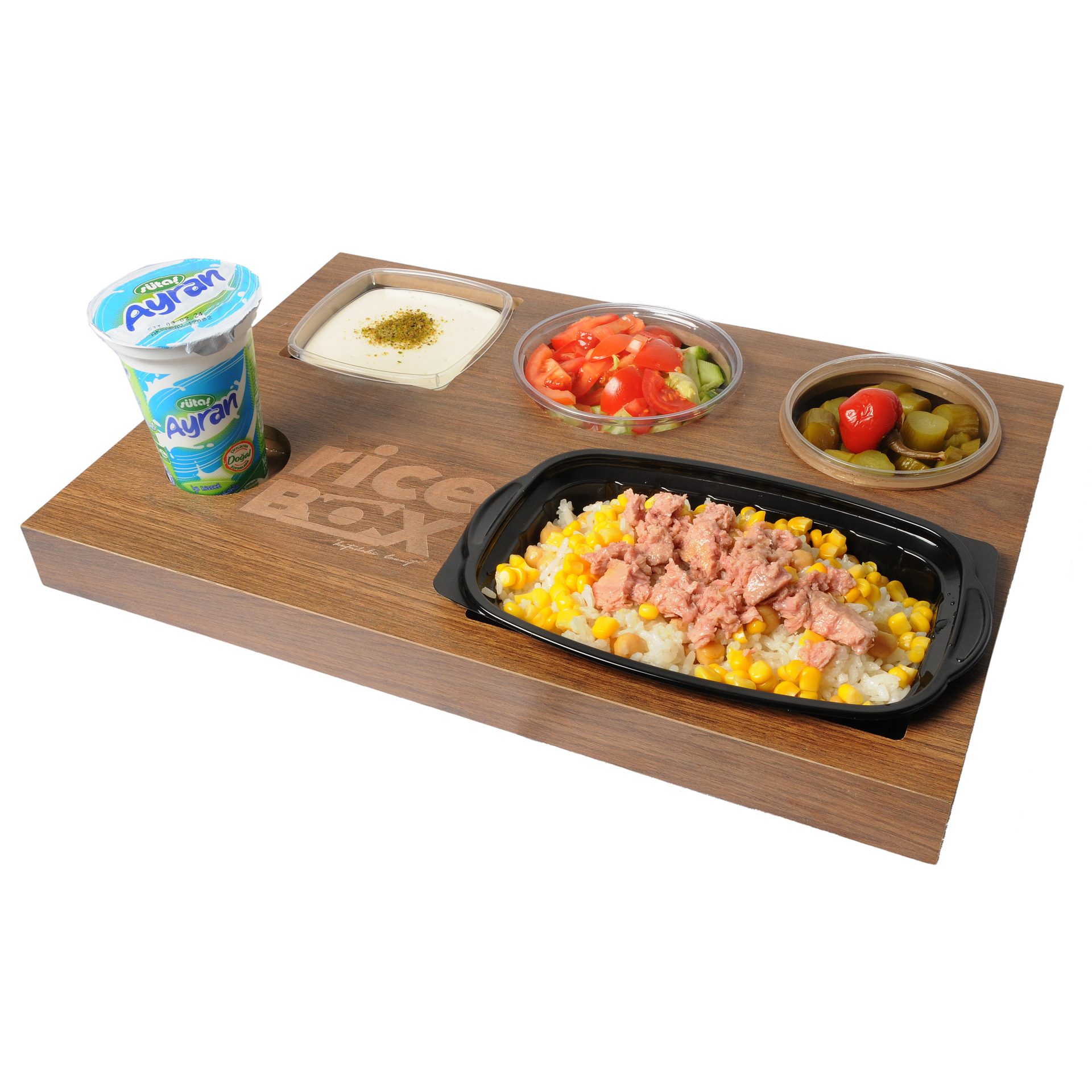 Ton Balığı, Pilav, Turşu, Salata, Alaçatı Muhallebisi, Ayran