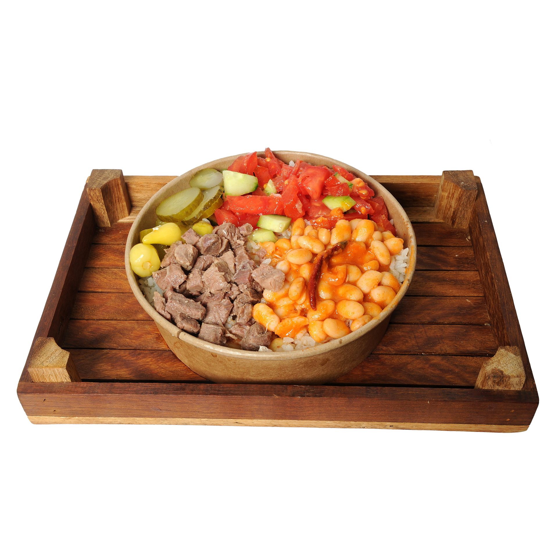 Kavurma-Kuru Pilav, Turşu, Salata, Alaçatı Muhallebisi, Ayran